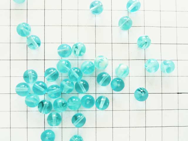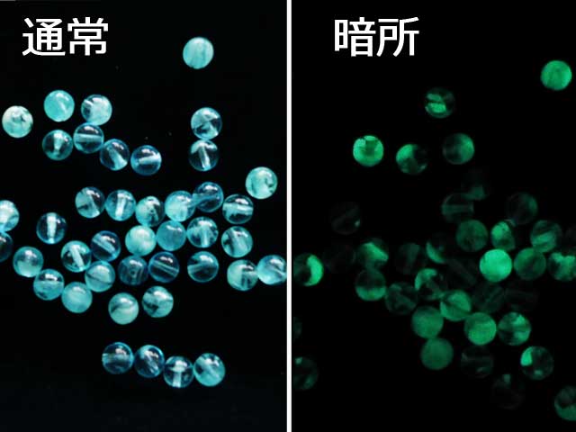 蓄光 グラスビーズ 8mm 水色通常の光の下では水色にイエローの部分が混ざったビーズ。暗所では最下部画像のように、溜まった光を放ってくれます。光り方は蓄積された光の量に比例するようです。画像のマス目は1cm四方です。大きさの目安にして下さい。8mm