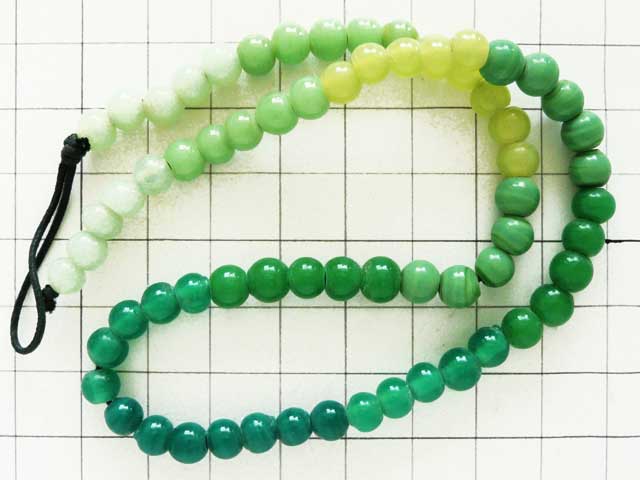 グラスビーズ 6mm 緑グラデ1連丸玉のグラデーションになった連ビーズ。約66粒。珠や穴の大きさ・模様には個体差があります。また製法上、気泡が含まれていることもありますのでご了承下さい。 画像のマス目は1cm四方です。大きさの目安にして下さい。14インチ(約36.5cm) 厚さ 6mm