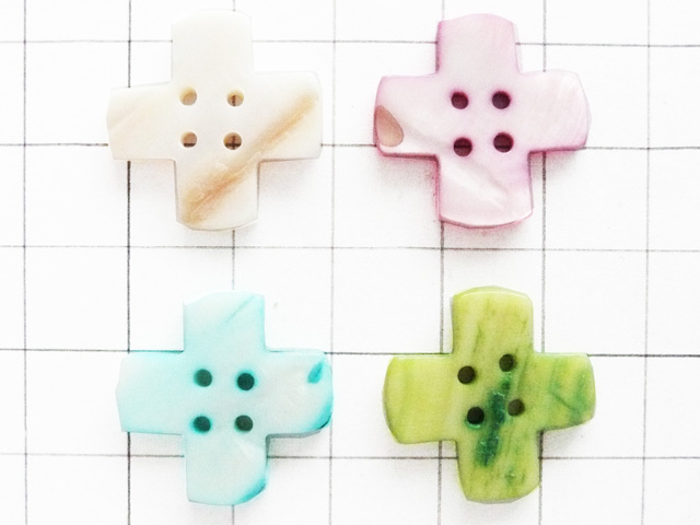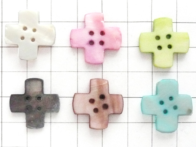 シェルビーズ クロスボタン十字型のかわいいシェルボタン。ビーズとしても、縫い付け用としても。天然素材のため、染色の具合や光沢には個体差があります。また傷の有無や厚みもかなり個体差がありますので、その旨ご了承下さい。参考画像(最下部)ご覧下さい。画像のマス目は1cm四方です。大きさの目安にして下さい。約20mm×20mm 厚さ 約1.8mm