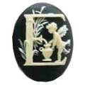 40×30 イニシャルカメオ Eアルファベットと天使のデザイン。地色は黒です。全種類、1個から単品でお求めいただけます。ご希望個数に満たない場合は随時お取り寄せ致しますので、メールにてお問合せ下さい。40mm×30mm