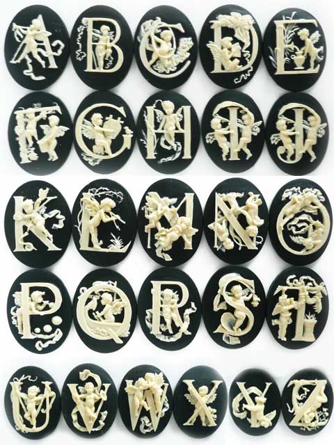 40×30 イニシャルカメオ Mアルファベットと天使のデザイン。地色は黒です。全種類、1個から単品でお求めいただけます。ご希望個数に満たない場合は随時お取り寄せ致しますので、メールにてお問合せ下さい。土台の仕上がりが今迄のものと新しいもの(薄型)がございます。どちらかお選び下さい。40mm×30mm