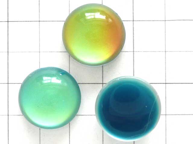 20mm アクリルカボション サーモアクリル製のカラーチェンジカボション。ムードビーズと同じく、温度変化によって色が変わります。見る角度によっても色が異なってみえます。製法上、底面は完全なフラットではなく、塗料の厚みにより、突端部がやや厚めに浮きあがっています。製法上、ふちにアクリル切断時のバリが残っている場合がございますので、ご了承下さい。 画像のマス目は1cm四方です。大きさの目安にして下さい。20mm 厚さ 約9~10mm