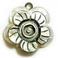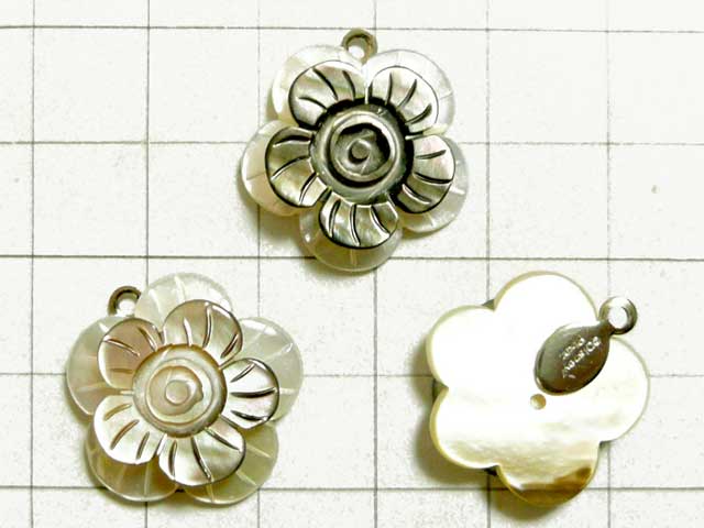 黒と白、二種の真珠層を使ったキュートなお花モチーフ。天然の真珠母貝ですので、一つずつ色味は違います。