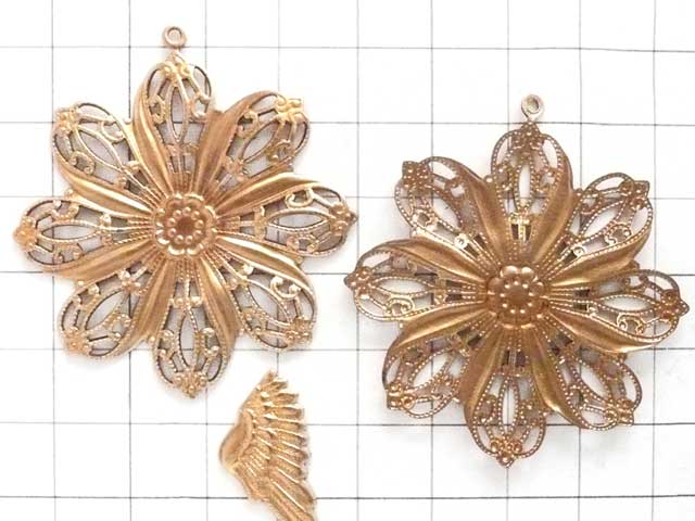 スタンピング 透かし花 1カン 真鍮1カン付きのお花モチーフ。花びらの透かし模様がとてもきれいです。プレス機で型抜きしたままなので、ふちが切りっぱなしです。直に肌に触れる際は、紙ヤスリをかけた方が良いかもしれません。50mm×46mm 厚さ0.7mm