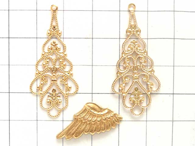 フィリグリー 細長ドロップ 金入り組んだ模様が美しい小さめドロップ。薄いので柔らかめです。その分、非常に軽量。プレス機で型抜きしたままなので、ふちが切りっぱなしです。直に肌に触れる際は、紙ヤスリをかけた方が良いかもしれません。画像のマス目は1cm四方です。大きさの目安にして下さい。真鍮スタンピングは色比較の目安にどうぞ。41mm×18mm 厚さ0.66mm