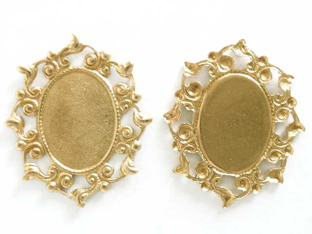 スタンピング 18×13オーバル台A 真鍮ふちの渦巻きのようなデザイン模様が、とても印象的。ストーンやカボションを引き立ててくれそうです。プレス機で型抜きしたままなので、ふちが切りっぱなしです。直に肌に触れる際は、紙ヤスリをかけた方が良いかもしれません。31mm×26.5mm