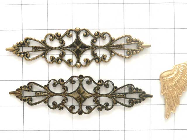 フィリグリー 細長ひし形 真鍮古美細長い小さめフィリグリー。両端を折り曲げて、カボションを包んでみても面白いかもしれません。(それだけで固定は難しいので、接着剤併用で)プレス機で型抜きしたままなので、ふちが切りっぱなしです。直に肌に触れる際は、紙ヤスリをかけた方が良いかもしれません。画像のマス目は1cm四方です。大きさの目安にして下さい。真鍮スタンピングは色比較の目安にどうぞ。16mm×56.5mm 厚さ 0.9mm