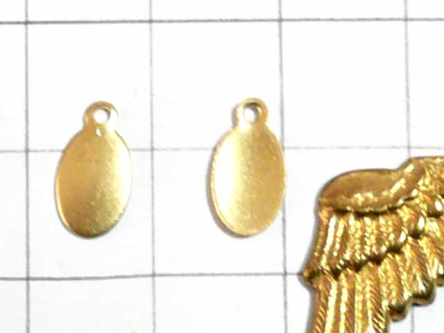 ドロップ 9×5 1カン付きタグ 真鍮ちっちゃな貼り付け用タグ。カボションを貼ってカン付きパーツに仕立てても良いですね。タグ自体がほんのり湾曲しています。画像のマス目は1cm四方です。大きさの目安にして下さい。真鍮スタンピングは色比較の目安にどうぞ。10.6mm×5.7mm 厚さ 0.6mm