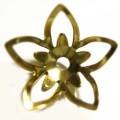 ビーズキャップ 17mm 5枚花 金スチールに金メッキの、しっかりした硬さのあるビーズキャップ。途中から花びらが繋がっているので、全開(真っ平ら)には出来ません。花びらの1辺が約10mm、12mmラウンドビーズを嵌めると、ふちから3mmほど花びらの先端が5つ、チラ見えする感じです。画像のマス目は5mm四方です。大きさの目安にして下さい。真鍮スタンピングは色合いの目安にどうぞ。17.3mm×16.5mm 高さ 8mm