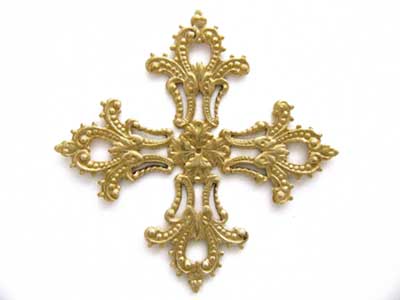 スタンピング ギリシャ十字 真鍮繊細な飾り模様の入った美しいクロス。斜めに使っても面白いかもしれません。プレス機で型抜きしたままなので、ふちが切りっぱなしです。直に肌に触れる際は、紙ヤスリをかけた方が良いかもしれません。56mm×56mm 厚み 1.06mm