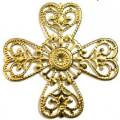 フィリグリー ハート十字 金先端がハート型になっている十字型のフィリグリー。プレス機で型抜きしたままなので、ふちが切りっぱなしです。直に肌に触れる際は、紙ヤスリをかけた方が良いかもしれません。画像のマス目は5mm四方です。大きさの目安にして下さい。真鍮スタンピングは色合いの目安にどうぞ。60.5mm×60.5mm 厚さ 0.8mm