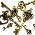 チャーム アンティークキーMIX 5個セット大小さまざまなサイズ・デザインのアンティーク調鍵のアソート。内容はお選びいただけませんが、サイズは分散されて入ります。画像のマス目は5mm四方です。大きさの目安にして下さい。真鍮スタンピングは色比較の目安にどうぞ。最大84.2mm×22mm 最小15.4mm×8.7mm