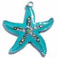 メタルチャーム ヒトデ ターコイズラインストーンが華やかなメタルチャーム。夏らしい色彩がきれいです。画像のマス目は5mm四方です。大きさの目安にして下さい。パッチン留めは色合いの目安にどうぞ。(カン含む)43mm×39mm 厚さ 2.6mm