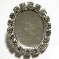 18×13 オーバル ボタンシャンク ストーン付 銀華やかにラインストーンが周囲を囲んだ、ボタン土台。非常に軽量です。裏面には1カン穴が付属しています。ボタンとして使ったり、縫い付け用パーツにしたりと色々活用できそうです。画像のマス目は5mm四方です。大きさの目安にして下さい。パッチン留めは色合いの目安にどうぞ。24mm×19.5mm 厚さ(カン穴部分含む) 5.7mm