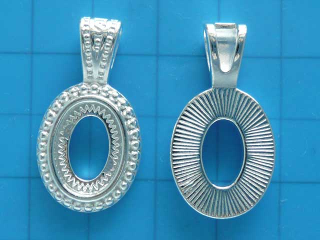 14×10 ペンダントST バチカン付 銀周囲の飾り模様がとてもキレイな14mm×10mmオーバル用のペンダントセッティング。貼り付け用です。フラットバック用ですが、ポインテッドバックのストーンでも出来そうです。参考画像の16×11のストーンはサイズもやや大きめの上、裏面がポインテッドですが、厚みが薄いタイプのため、うまく嵌っています。画像のマス目は1cm四方です。大きさの目安にして下さい。30.7mm×16.7mm 厚さ6.5mm