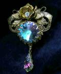 リヴォリのブローチ模様の美しいシャンデリアパーツに台座と薔薇モチーフのスタンピングを取り付けたシンプルなブローチ。リヴォリは14mmサイズです。ヴィンテージのヴィトレイルライトなので、現行品とは色合いが少し異なります。ドロップ部分にはバロックのアイリスドロップ(何れも販売終了品)。