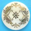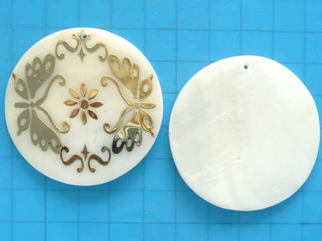 シェルに真鍮のシールプリント。1ホール付き。厚みは2mm以上あり、しっかりしています。プリントの向きと穴の位置は定っていませんので、個体差があります。